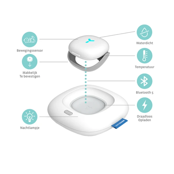 - – Meet ademhalingsbewegingen, huidtemperatuur, lichaamspositie en activiteitsniveau tijdens het slapen