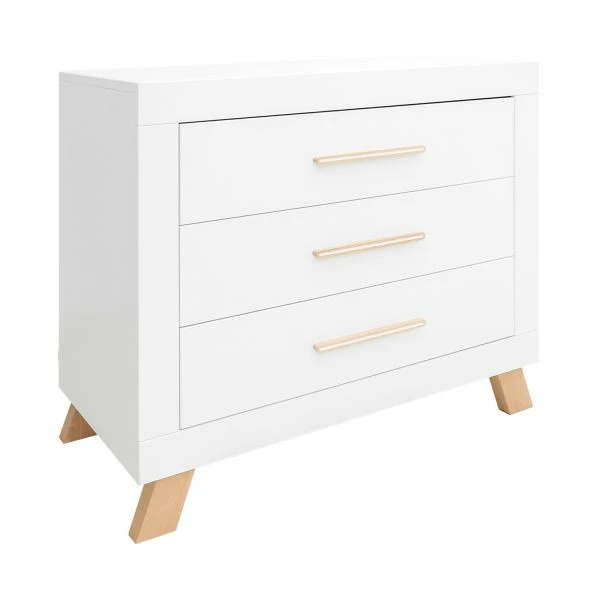 De commode van de Bopita Lisa serie beschikt over drie opbergladen die voorzien zijn van soft-closing. De laden hebben ieder een handgreep in een beukenhouten kleur en de poten hebben ook deze betreffende beukenhouten kleur. Doordat de poten schuin zijn creëer je een Scandinavische look. Het is een praktische commode wat veel opbergruimte biedt.
