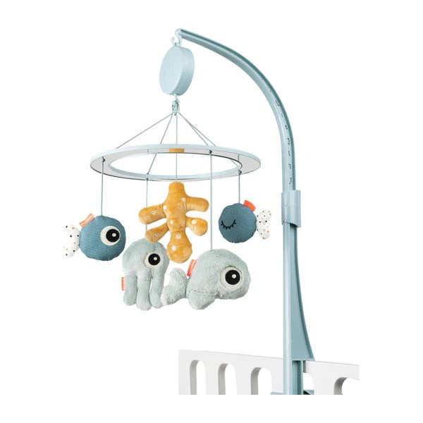 De Done by Deer Sea Friends Muziekmobiel Blue is een leuke muziekmobiel met verschillende knuffeltjes uit de Sea Friends serie. De muziekmobiel bevestig je door middel van een bevestigingsclip aan een ledikant, wieg of box. Het leuke melodietje van de muziekmobiel laat je kindje kennis maken met muziek. Door de mobielfiguurtjes ontwikkelt je kindje motorische vaardigheden zoals, grijpen en kijken.