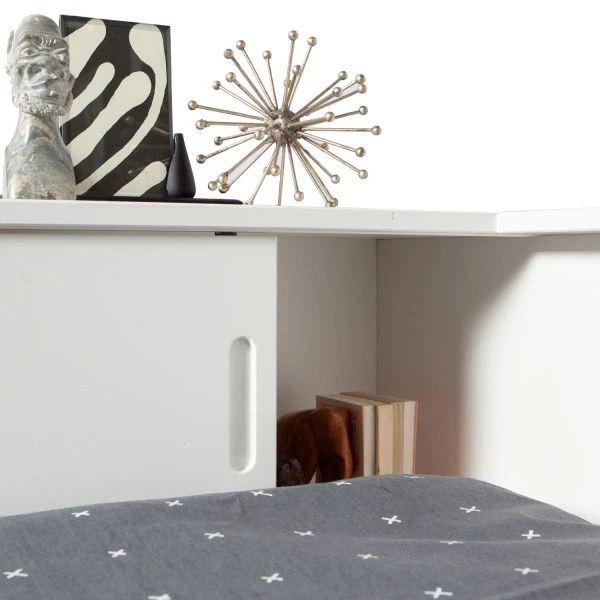 Het Woood Connect Hoekbed Wit is een praktisch bed wat de vorm heeft van een hoek. Zo kan het precies in een hoek staat. Het bed beschikt over een hoofdbord en over de gehele breedte bevind er een opbergmogelijkheid die uit twee brede vakken bestaat. Deze vakken worden afgesloten met een schuifdeur waardoor het goed opgeruimd kan zijn. Het bed beschikt over een laag voetenbord. De lattenbodem en het matras worden niet bij dit bed geleverd. De montage-instructie zit bij dit meubel geleverd waardoor het in elkaar zetten eenvoudig gaat.